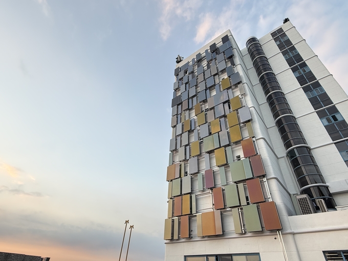 건물 외벽 전면에는 25kw 규모의 컬러 태양광 패널 152개(총면적 240㎡)를 설치해 ESG를 실천했다. 전력 생산과 예술적 조형미를 결합한 설비로, 낮에는 태양광을 흡수해 에너지를 생산하고 밤에는 외벽 조명을 통해 은은한 빛의 연출을 선보이는 공공예술 작품이다.
