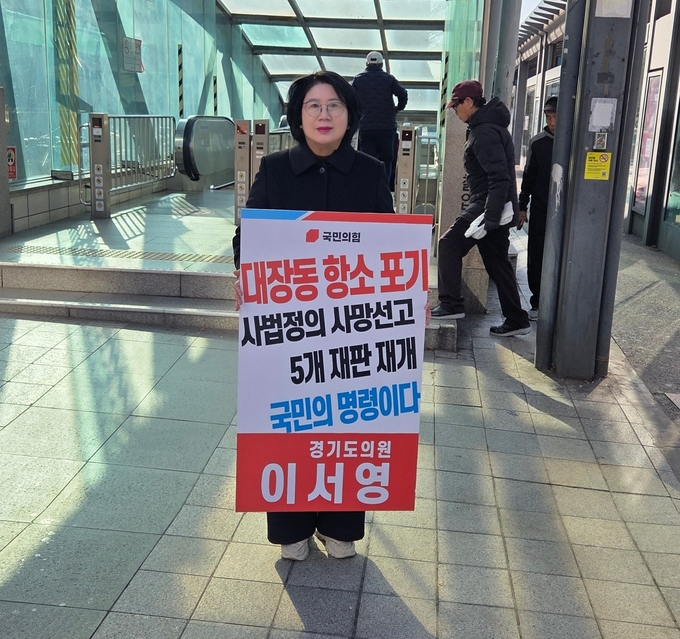 경기도의회 이서영 의원(국민의힘, 비례)이 최근 검찰의 ‘대장동 사건 항소 포기’ 방침을 규탄하며 19일 오전 부터 1인 시위를 시작했다.