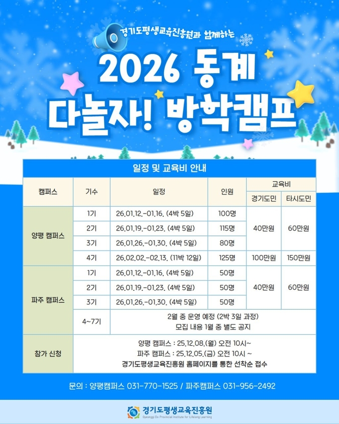 다가오는 겨울방학을 맞아 경기도평생교육진흥원이 경기미래교육캠퍼스에서 1~2월 한 달간 ‘다놀자! 방학캠프’를 운영한다. 전국 초등학교 3학년부터 중학교 1학년 학생이라면 누구나 참여할 수 있으며, 파주 캠퍼스는 12월 5일, 양평 캠퍼스는 8일부터 모집을 시작한다.