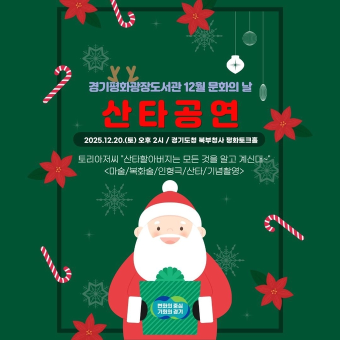 경기도는 12월 19일과 20일 이틀간 도 북부청사 평화토크홀에서 ‘모두가 함께하는 겨울 감성 공연-함께 읽고, 함께 웃는 하루’를 주제로 경기평화광장도서관 12월 문화의 날 행사를 연다.