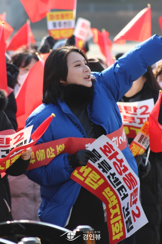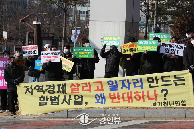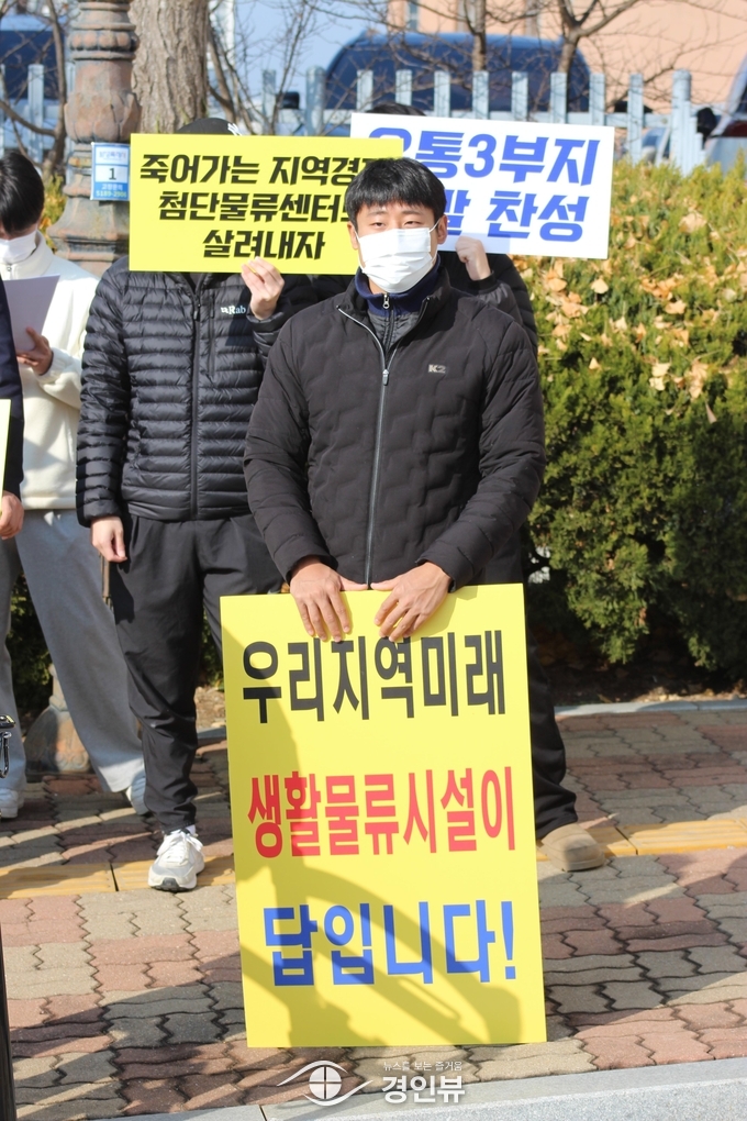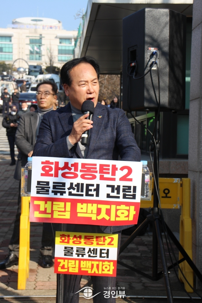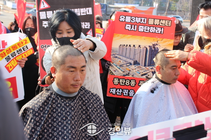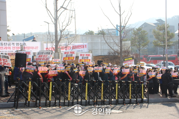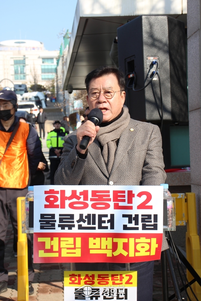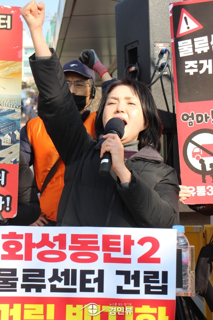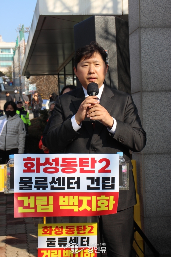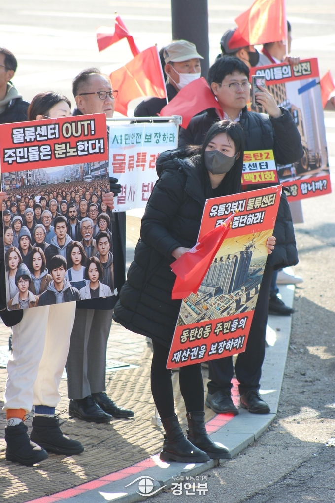 화성시청 정문 앞, 도로를 사이에 두고 동탄물류센터 건립 찬성측과 반대측이 벌이는