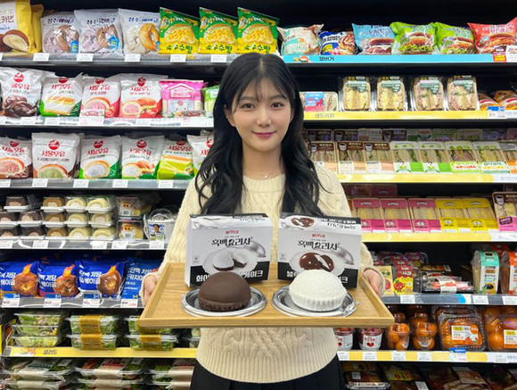 ▲ GS25에서 모델이 ‘흑·백 크림 케이크 2종’을 선보이고 있다 . (사진 GS리테일 제공)