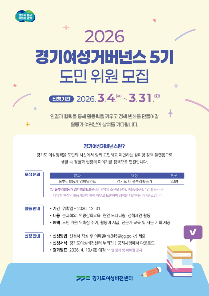 경기도여성비전센터가 2026년 ‘경기여성거버넌스’에서 활동할 도민위원을 오는 3월 31일까지 모집한다.