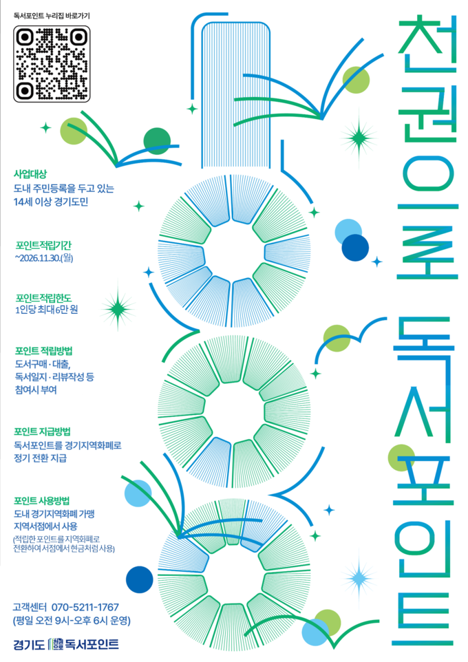 윤명희 경기도서관장은 “책을 읽는 경험이 생활 속 혜택으로 이어지도록 경기도 대표 독서문화 프로젝트인 ‘천권으로’와 연계해 독서포인트 사업을 설계했다”면서 “경기도민이 책과 함께 걷는 평생 독서의 길을 함께 하길 바란다”고 말했다.