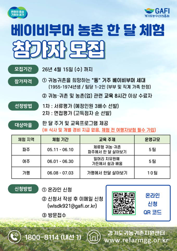 경기도농수산진흥원은 오는 15일까지 베이비부머 세대를 대상으로 농촌 한 달 살기 프로그램 참가자를 모집한다.