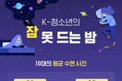 최근 슬리포노믹스(Sleeponomics), 슬립테크(Sleep-tech) 등 수면 관련 경제·산업 트렌드가 주목받고 있다. 대학내일20대연구소는 지난해 10월 24일부터 31일까지 8일간 전국 15~55세 남녀 1200명을 대상으로 수면 인식 및 행태를 조사하고, 그중 10대(15~18세)의 수면 생활과 관련한 주요 데이터를 27일 인포그래픽 형태로 공개했다. ▲ ‘K-청소년의 잠 못 드는 밤’ 인포그래픽 10대 청소년, 평일에 덜 자고 주말에 몰아 잔다 이번 조사에서 10대의 수면 시간은 평일 평균 6.3시간으로 나타나 OECD 평균(약 8.5시간)보다 현저히 짧았다. 평소 6~8시간(57.0%) 잔다는 응답이 1위였고, 6시간 미만(31.6%), 8~10시간(11.4%) 순이었다. 반면 주말 수면 시간은 평균 8.6시간으로, △8~10시간(44.3%) △6~8시간(27.8%) △10시간 이상(25.3%) △6시간 미만(2.5%) 순으로 높은 응답률을 보였다. 10대가 평일에 6시간 미만 잔다고 답한 비율은 전체(16.3%)에 비해 2배가량 높았고, 주말에 10시간 이상 잔다고 답한 비율은 전체(13.2%)의 2배 수준으로 나타났다. 즉 10대는 평일에